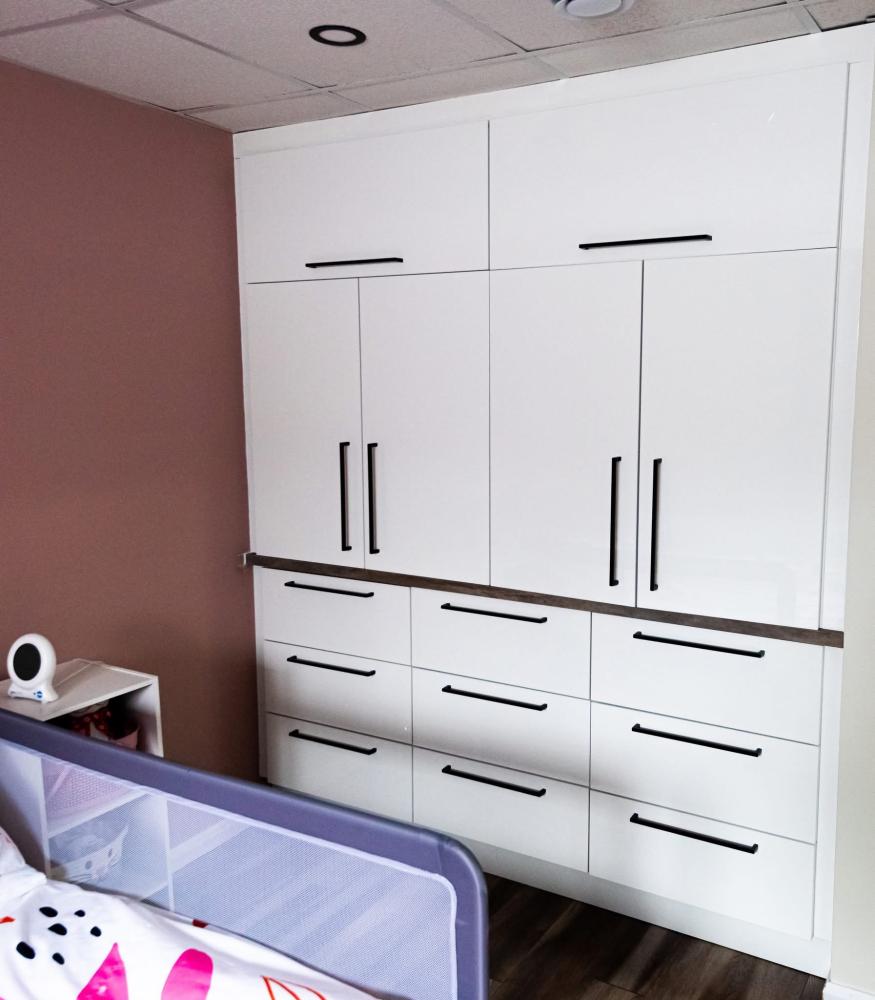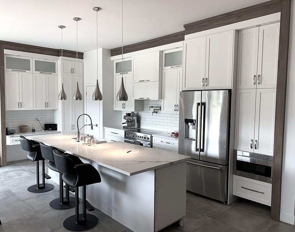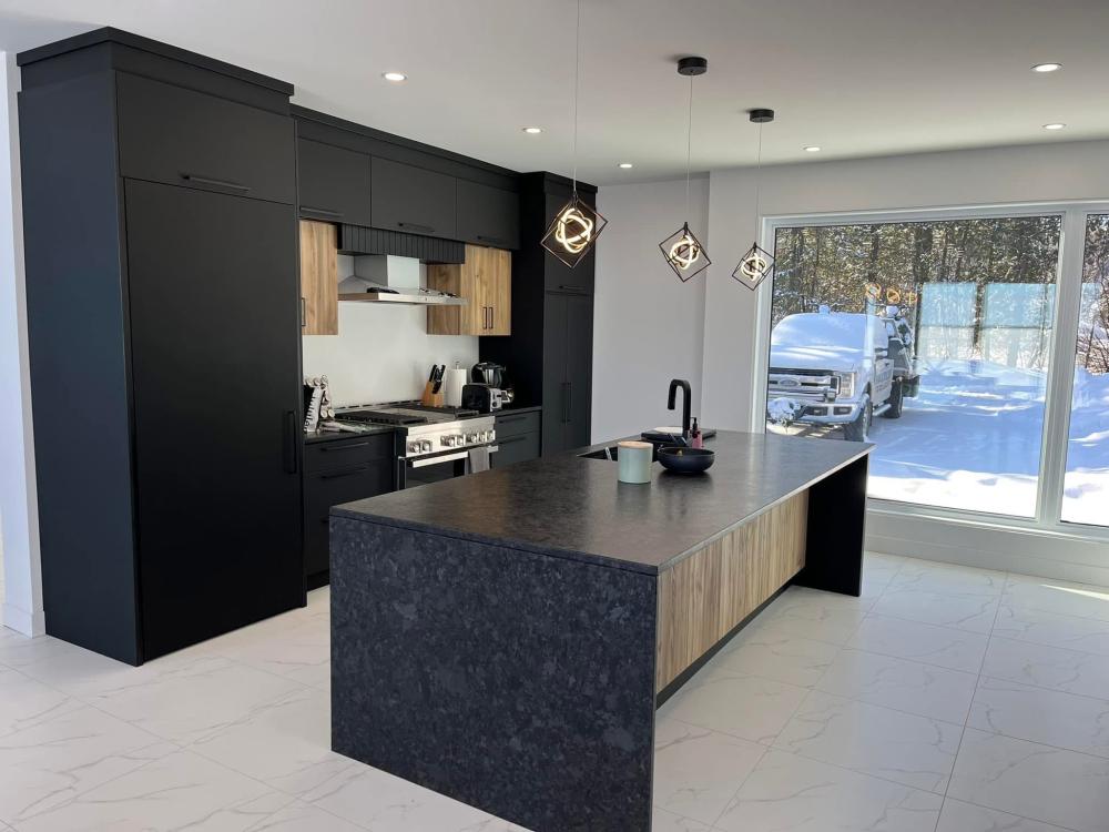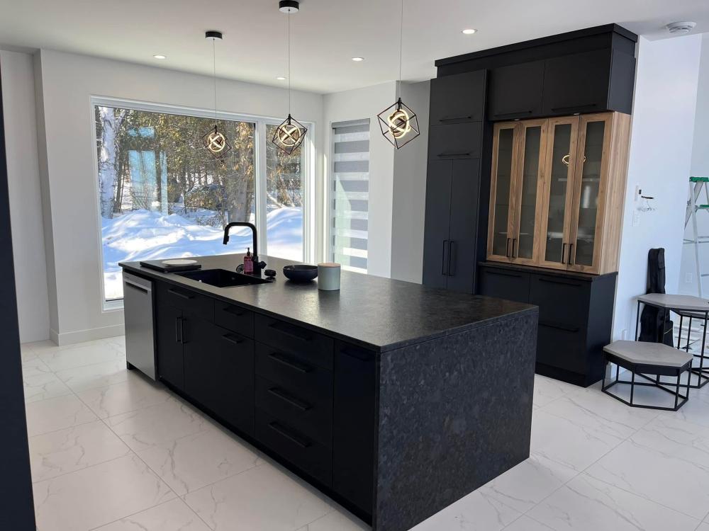 Conception, fabrication et installation complète de vos armoires, îlots, rangements et finitions.