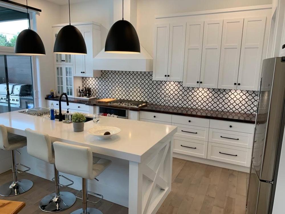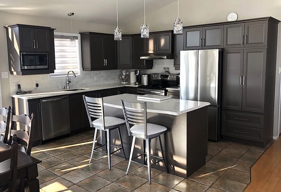 Conception, fabrication et installation complète de vos armoires, îlots, rangements et finitions.