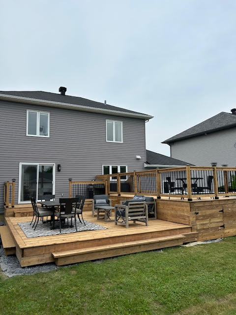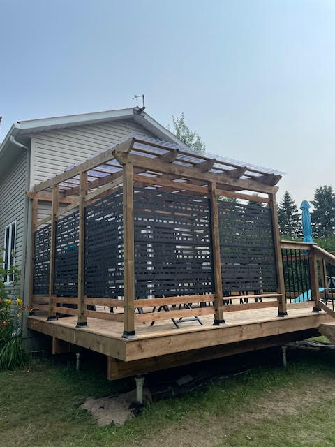 Patios en bois et aménagements extérieurs : conception et construction de patios solides et esthétiques, ainsi que de pergolas, gazebos, balcons et terrasses surélevées.
